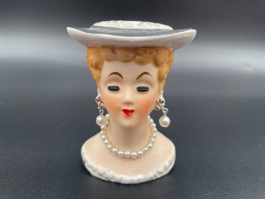1950s Mini Lady Head Vase Pearl Necklace & Earrings Black Dress & Hat Red Lips