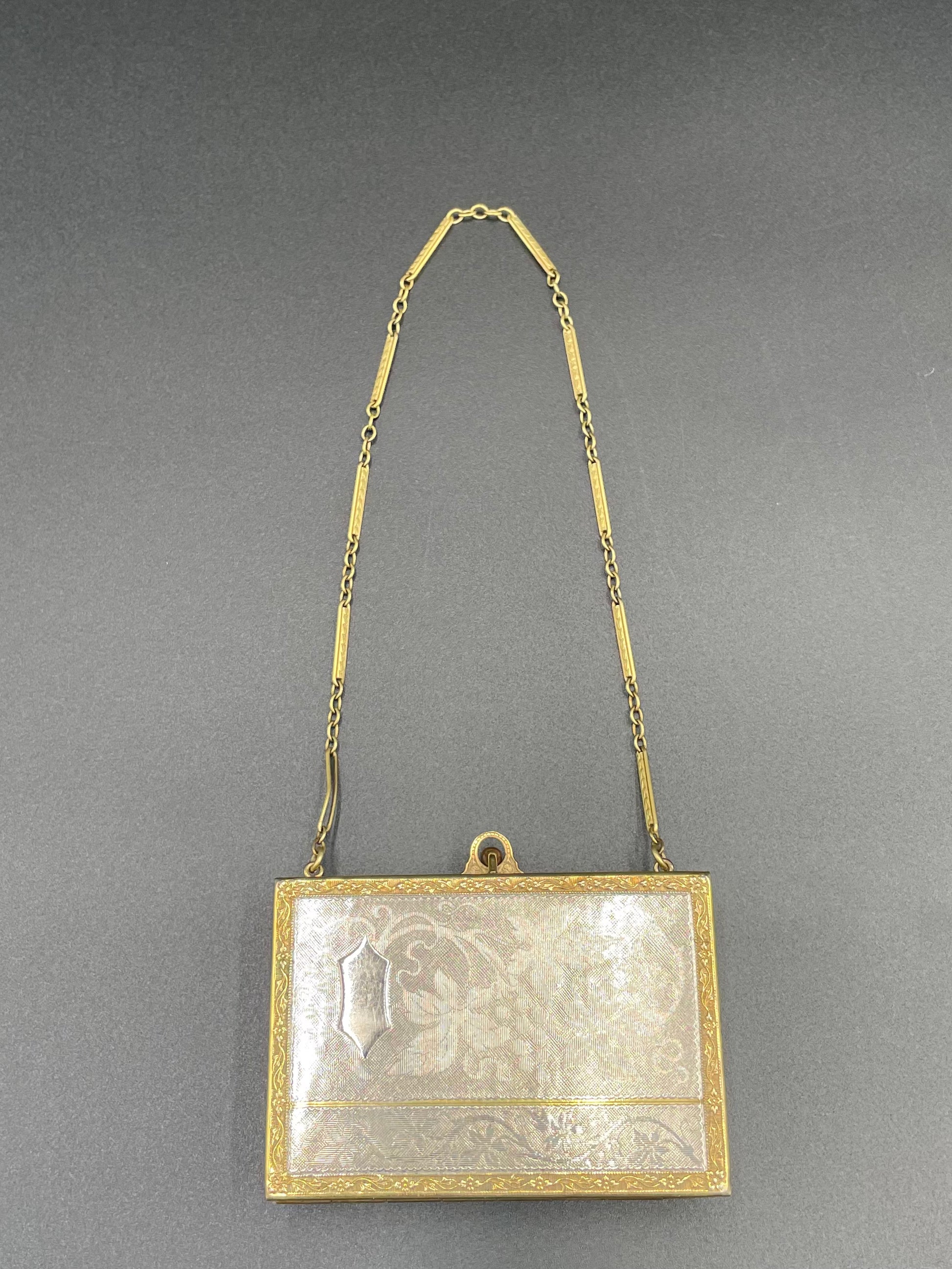 Outside: exquisite two-tone gold and silver tone gilt, brass metal with sturdy, yet dainty, gold link chain handle. The silver and gold side is embossed with an art deco design of grapes and vines. There is an emblem in the upper left corner that could be monogrammed for an added special touch. Opens and closes securely.