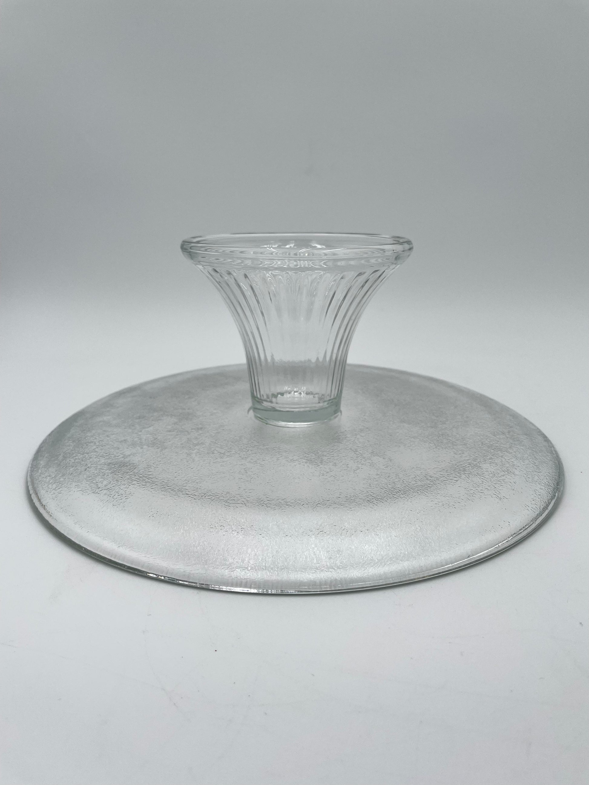 The clear glass tray features a frosted plate with a 1/4" raised edge resting on an elegant ribbed pedestal base.