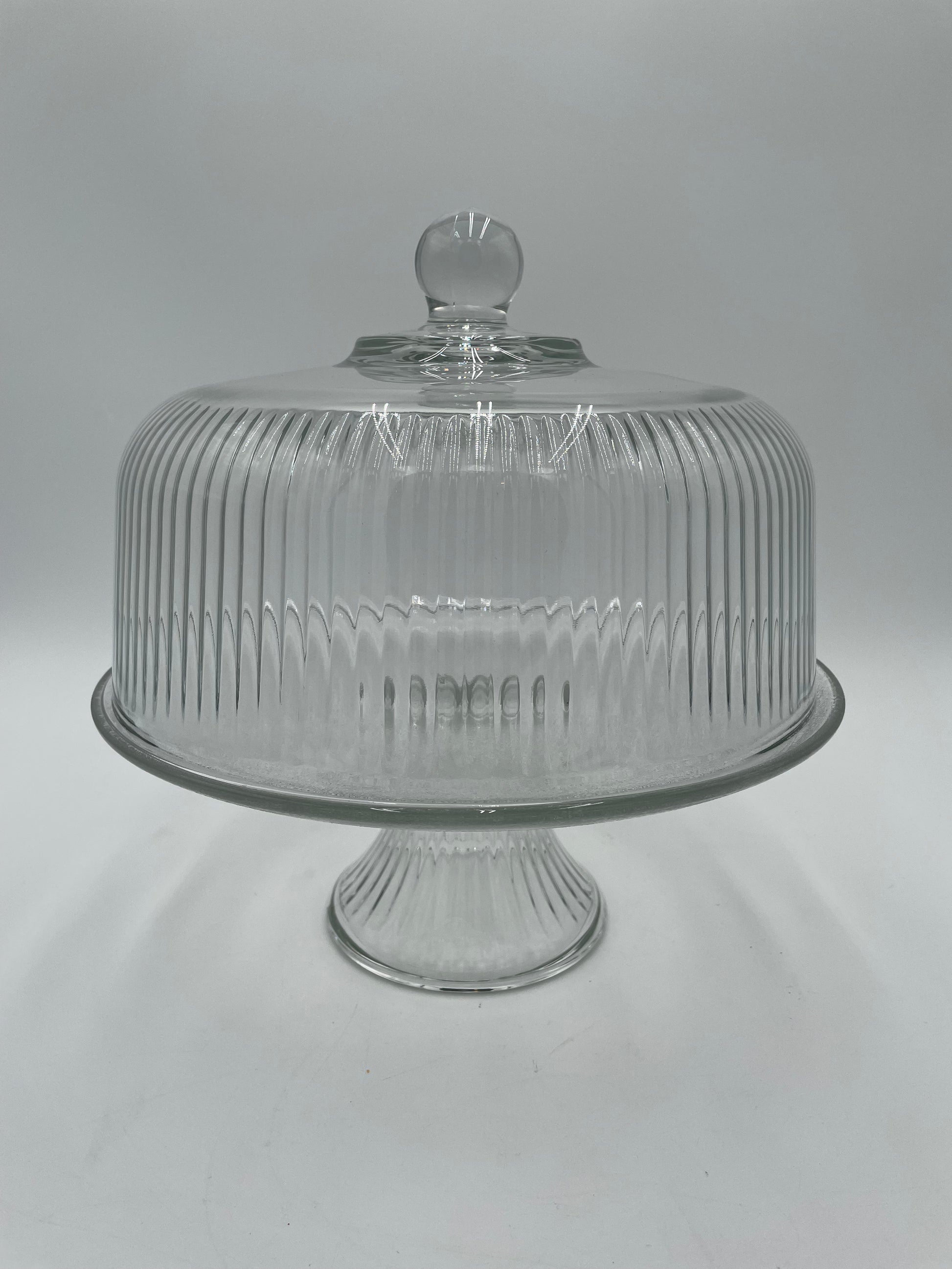 Vintage Anchor Hocking Monaco Ribbed Glass 11" Cake Stand w/ Dome