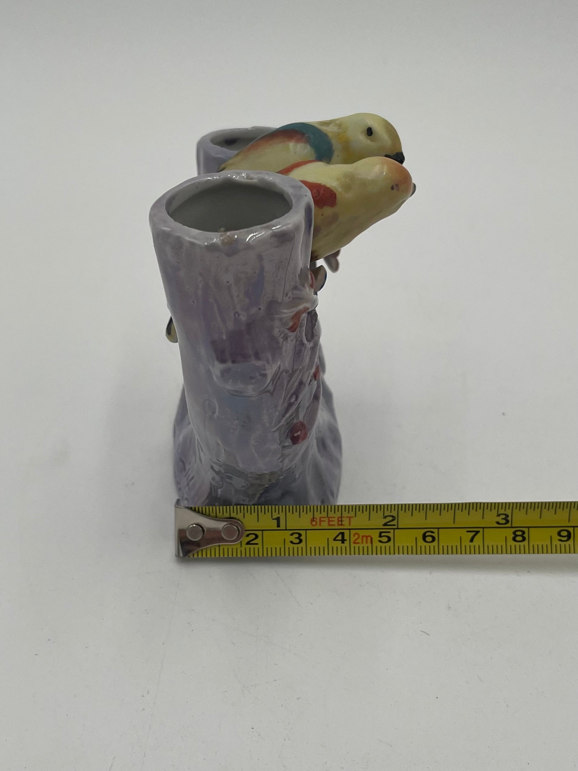 Vintage ceramic parakeet double flower bud vase. This is a shiny purple glazed porcelain piece.