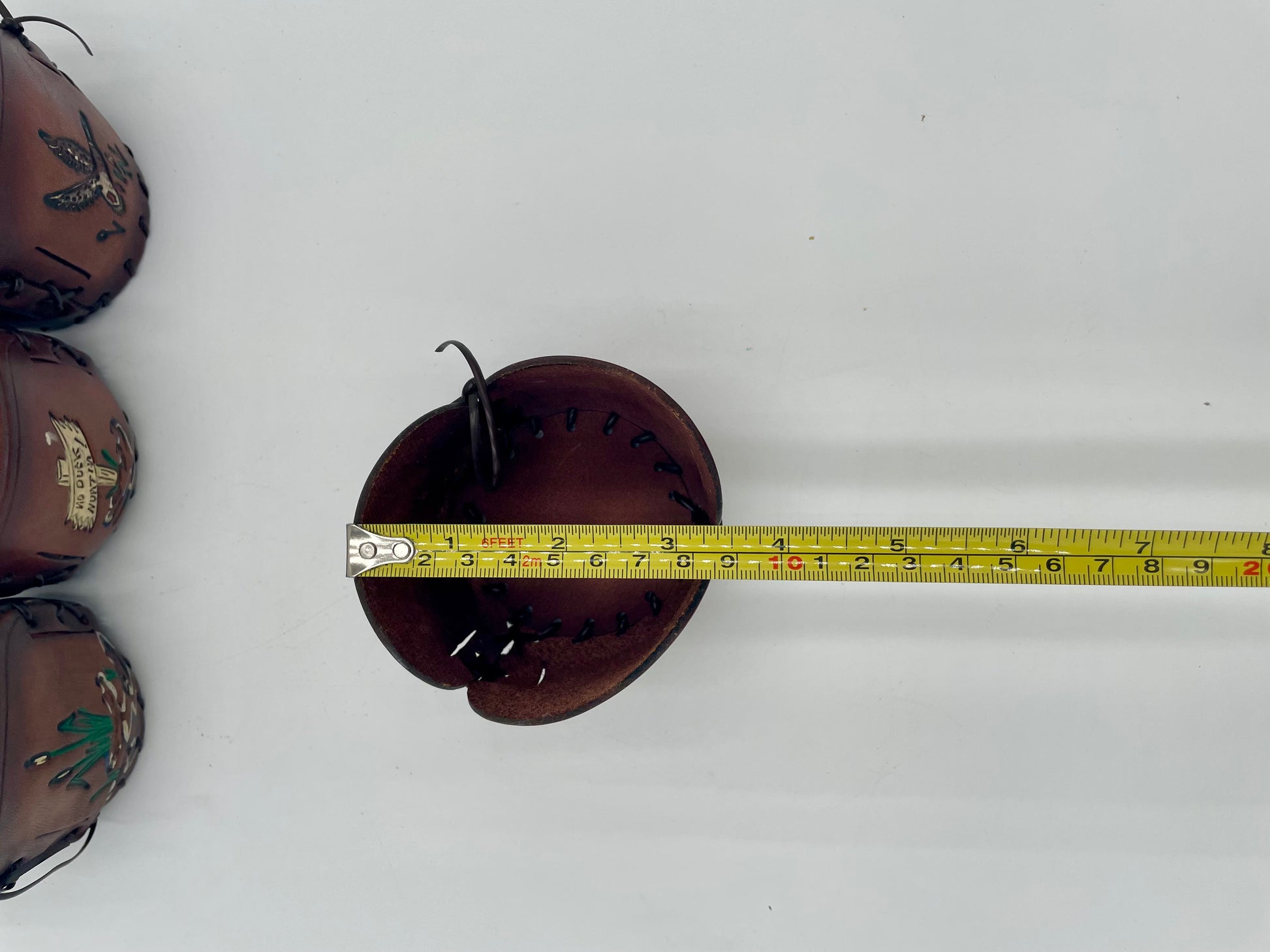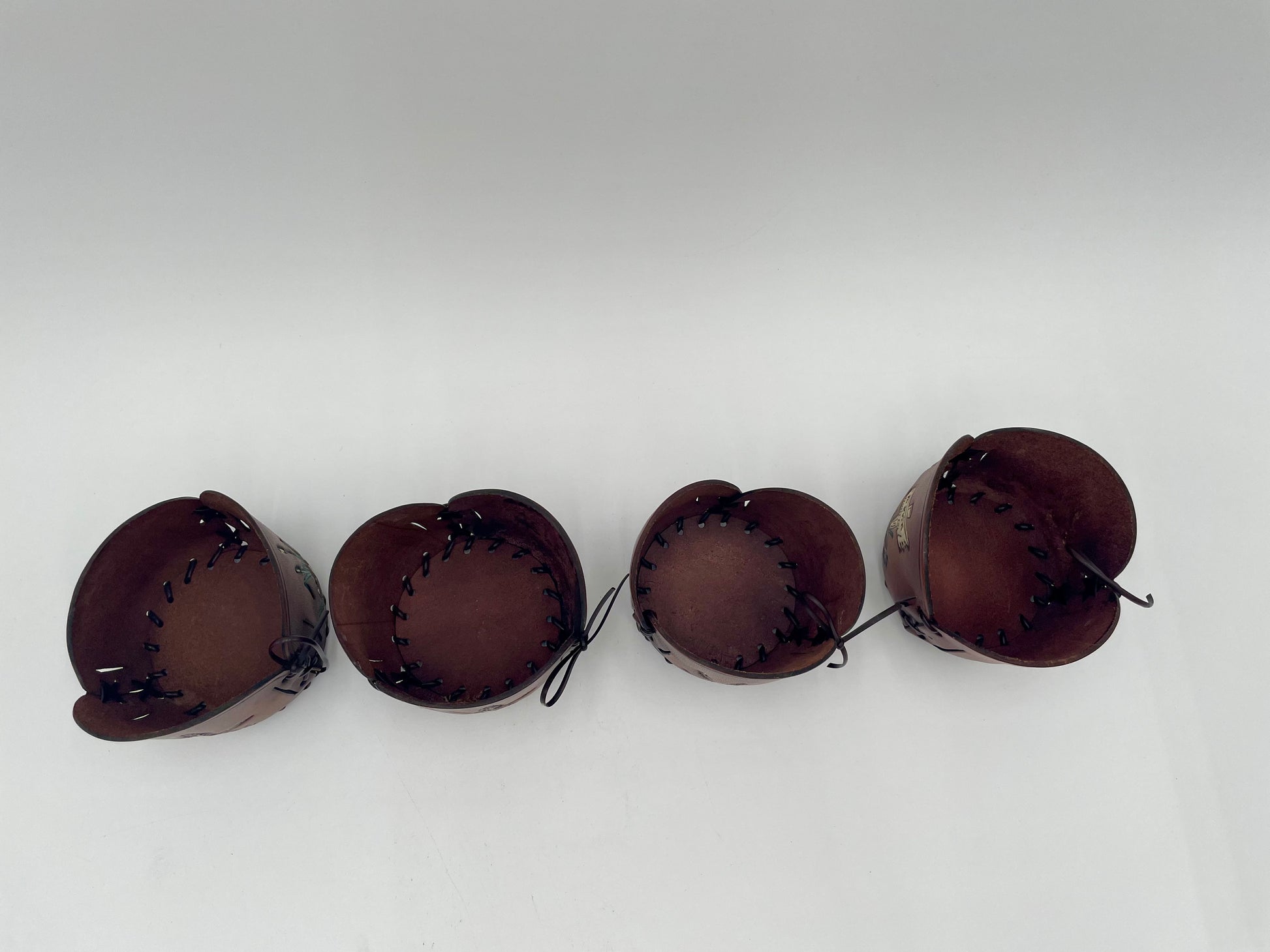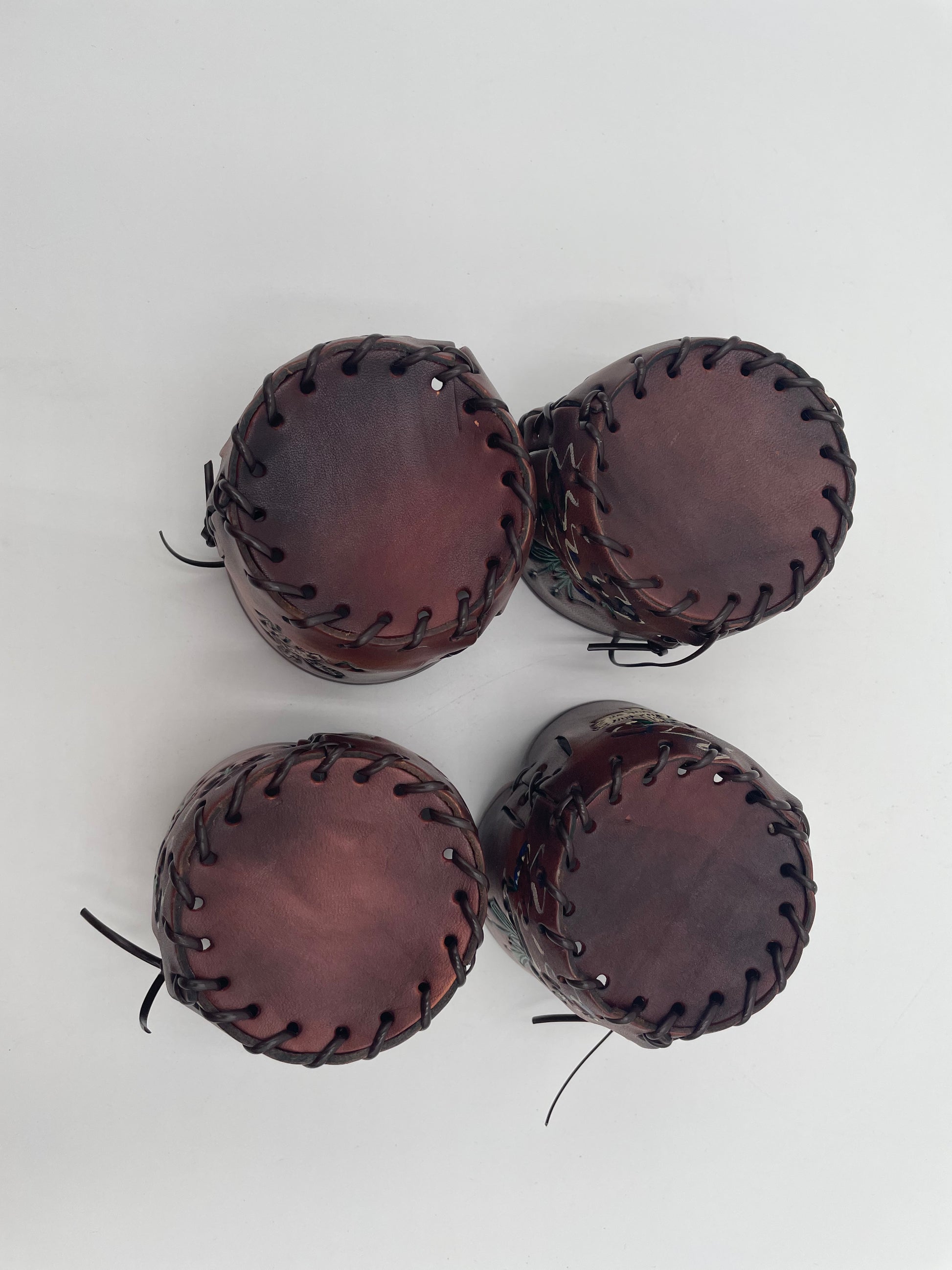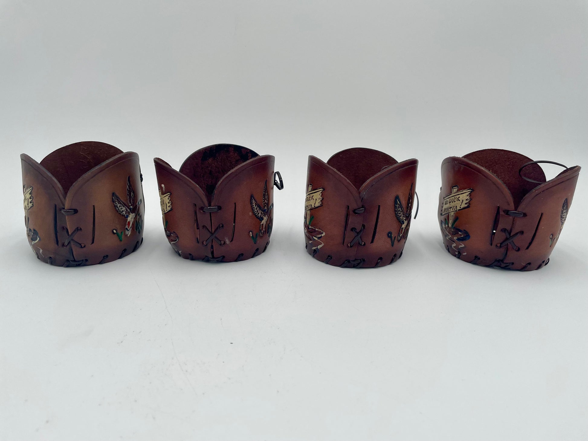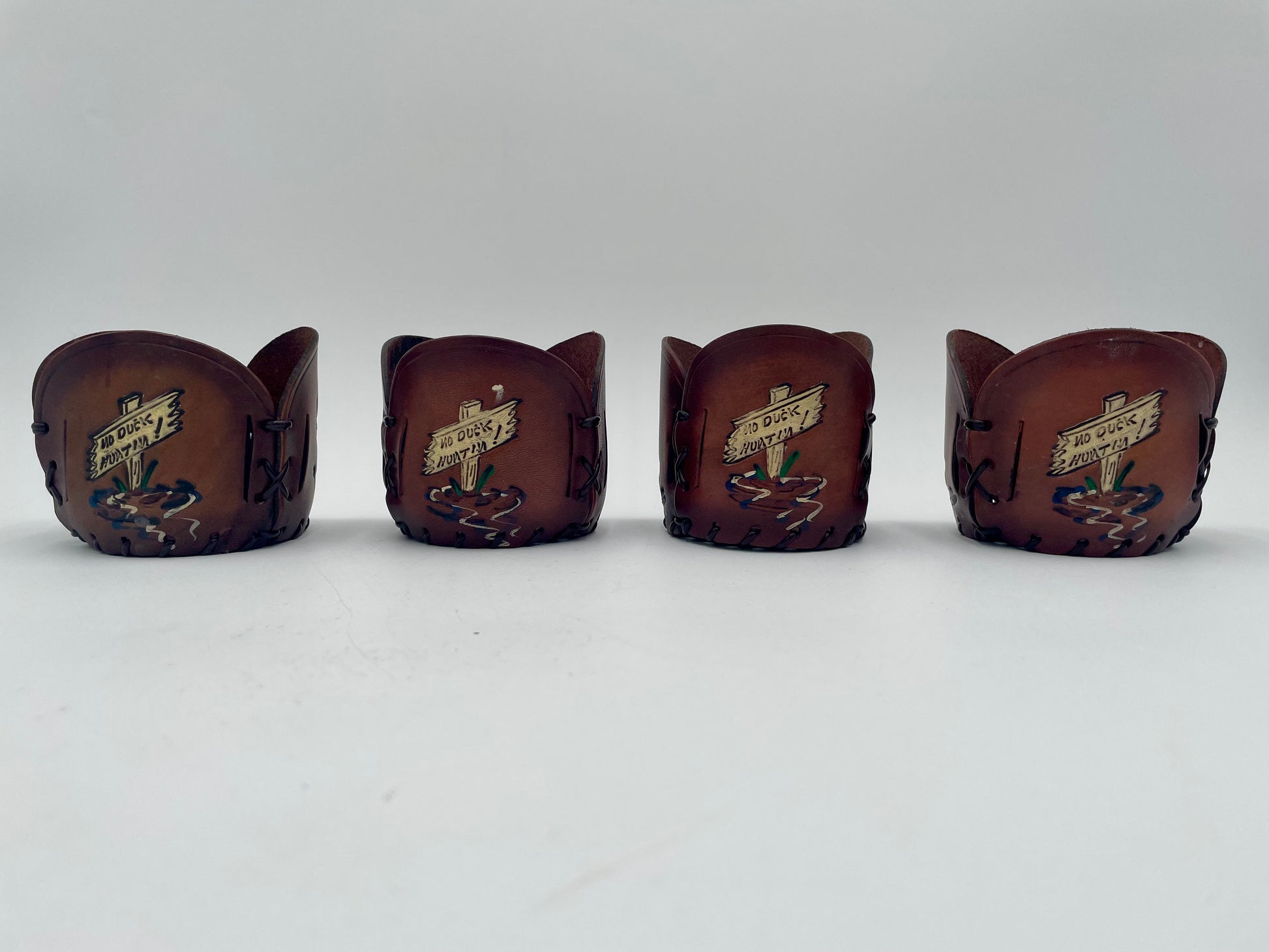 Vintage Set of 4 Highball Drinking Glass Tooled Leather Holder Mallard Ducks