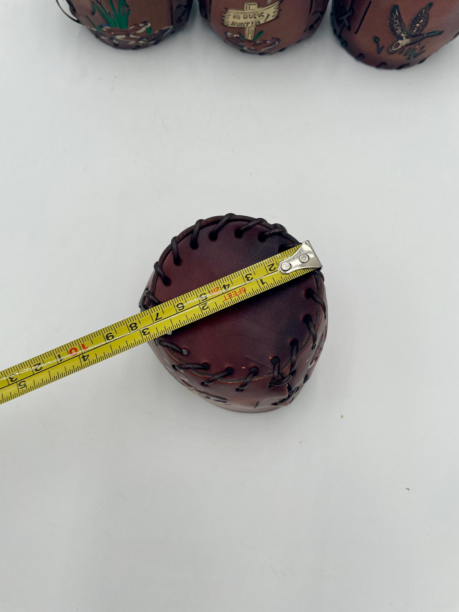 1970s three-sided duck themed leather highball drinking glass holders. In great condition with vibrant colors. Measures 3" tall x 3" wide. See pictures for details.